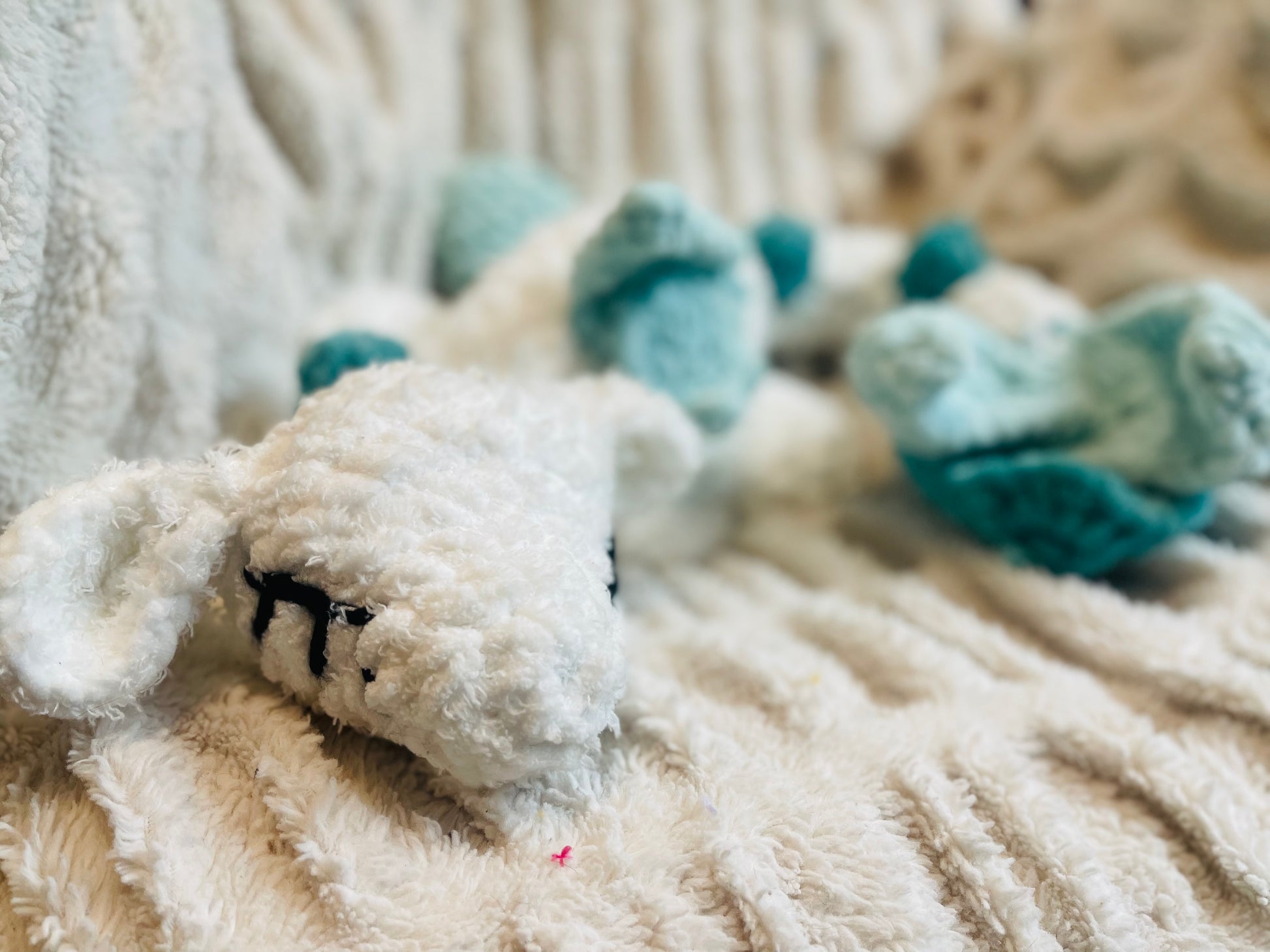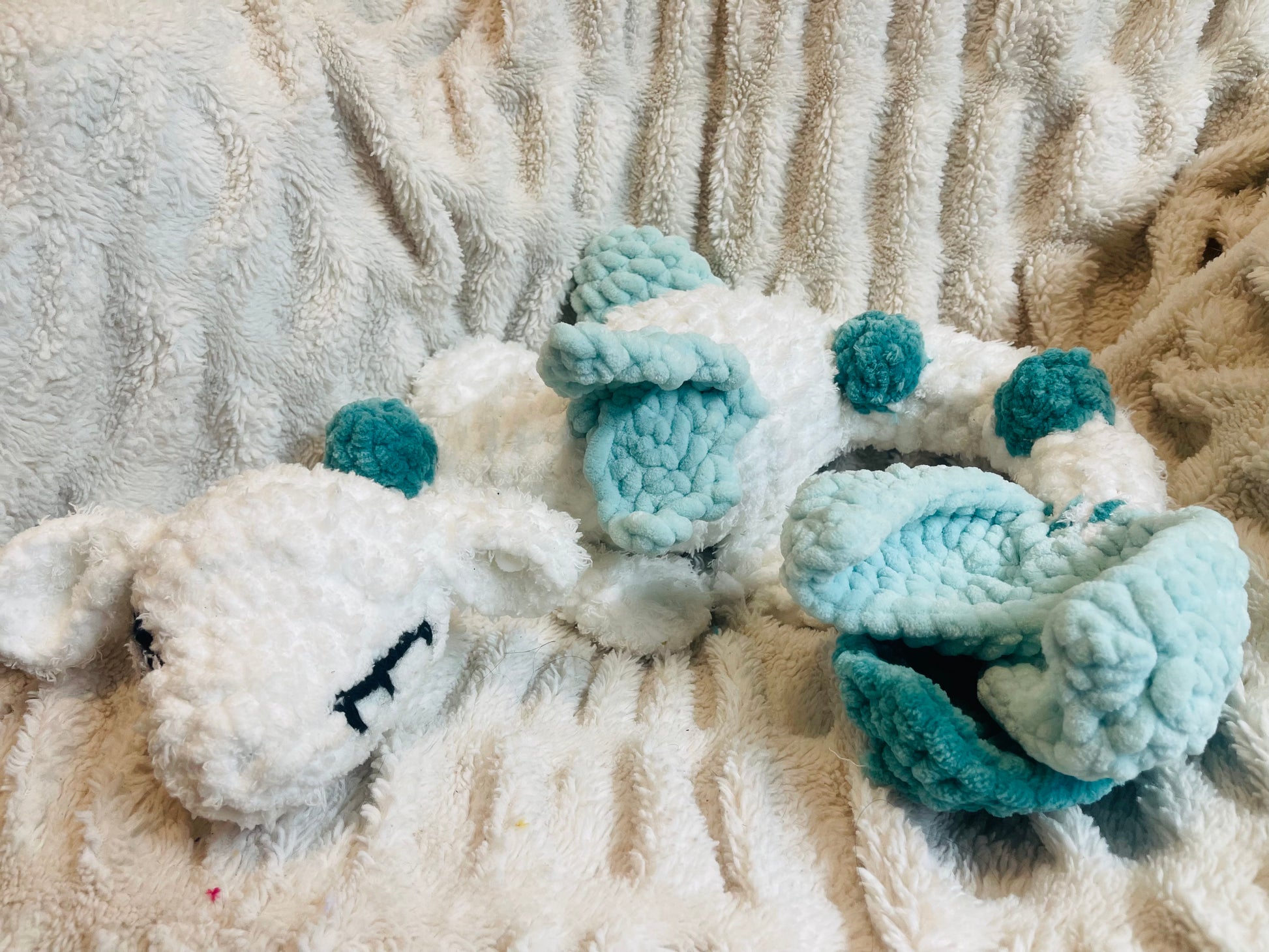 Introducing Sea Monster, the cutest addition to your home. Hand crocheted with a fuzzy textured yarn, this adorable creature features floppy ears and a teal leaf tail. Measuring 2ft'5 and with a heavier weight, she's perfect for snuggling or as a unique piece of interactive art.